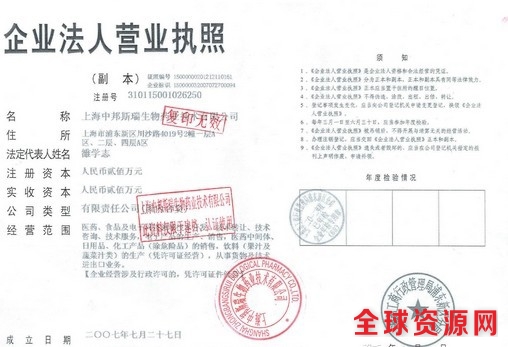| 发证机构 | 上海浦东新区工商管理局 | 发证时间 | 2007-07-27 |